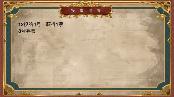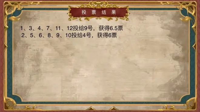 4号真(警长,未知):首先,感谢我的金水能认下我,我也能认下3.7是两个好人,但是12的身份还是有待确定的吧。目前我认5.9.10是3狼人,容错在2.6,但2保了一手我的金水,所以我今晚去开这个6号吧。8号我觉得他可能是暗恋了狼队的暗恋者或站错边的好人,毕竟他没有投匪票。如果我明天还能活着,我再去抓倒钩。警徽流6.12顺验,归票下9,发言结束