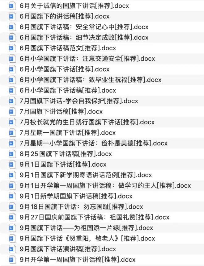 包含中小学各年级各类主题(爱国教育、安全教育、文明礼仪、励志进取、考前动员、传统节日文化、校园活动、纪念日等等)共2000+讲话稿范例