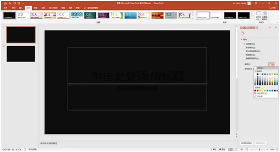 首先打开PPT软件,点击添加第一张幻灯片。幻灯片默认为白色背景,首先需要把它设置为黑色,这样才可以在切换台或者编辑软件中配合LumaKey实现字幕效果。选择[设计],点击黑色背景的幻灯片模版即可完成,如果设计中没有对应的模版,只需要点击后方的设置背景格式,在纯色填充的模式下将颜色改为黑色并点击应用到全部。注意要将PPT大小设置为16:9。