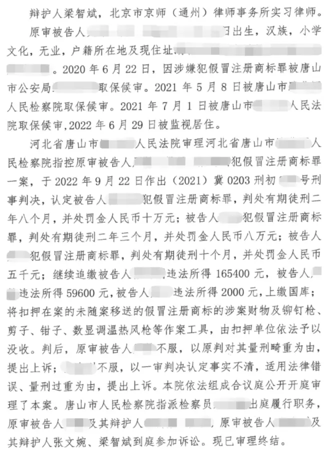 河北省唐山市路北区人民法院一审判决认定被告人Z某某犯假冒注册商标罪,判处有期徒刑二年八个月,并处罚金。二审委托北京市京师(通州)律师事务所张文婉律师、梁智斌实习律师代理本案,成功撤销原判,发回重审。
