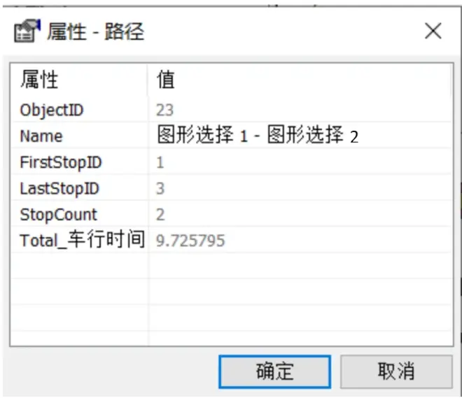 (6)查看详细数据。右键点击【Network Analyst】面板中【路径】项下的路线【图形选择1一图形选择 2】,在弹出菜单中选择【属性...】,显示【属性】对话框,如图所示。列表中【To- tal_车行时间】为累计的阻抗值,这里是车行时间。