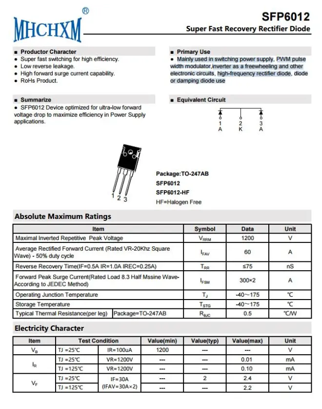 ASEMI代理海矽美SFP6012, 快恢复二极管SFP6012规格