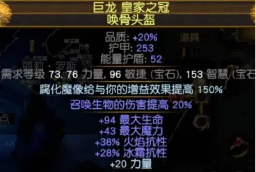 4、头盔:唤骨头盔底子。有20%召唤伤,找属性的话,就抗性、血量,补敏捷、力量属性,迷宫附魔这个随缘,只要是你身上能吃的,都可以,最好是“愤怒狂灵伤害提高40%”,我的是“腐化魔像增益效果提高”