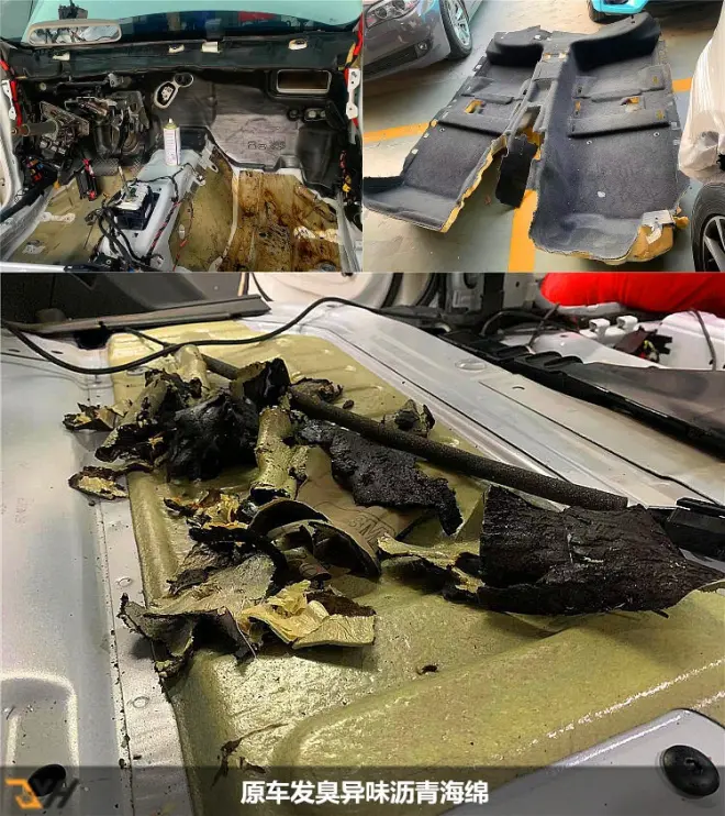 拆开原车防火墙、底盘我们可以看到一层厚厚的异味“元凶”,含有沥青成分的阻尼片就出现在我们面前,在夏天的烈日下,车体的金属部分在长时间的阳光照射下,温度可上升至100℃以上,这种温度下紧贴在车体上的沥青隔音材料便会出现融化的痕迹,并且还散发着刺鼻异味等有害气体,严重危害到身心健康!!