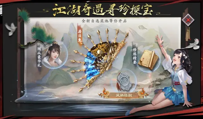 奖励包含「新春豪侠任选礼」奖励,少侠可在以下奖励中任选一种:「枯冢碎片*5」、「锦云碎片*5」、「招财碎片*5」