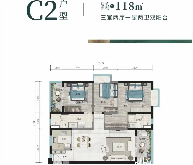 优点:动静分区、干湿分离,客厅大阳台 缺点:主、次卧以及北向卧室外是过道,私密性差 118㎡(C1):三室两厅两卫双阳台;
