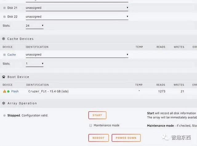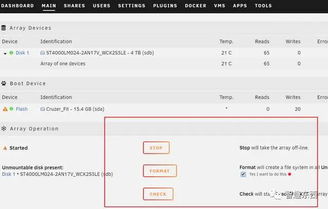 基础工作准备完毕,我们就需要配置UNRIAD了。切换选项卡到“Main”一项,然后分别设置磁盘。对于一般应用,我们可以忽略掉校验盘(Parity Devices)、缓存盘(Cache Devices),只使用存储磁盘功能(Array Devices)。