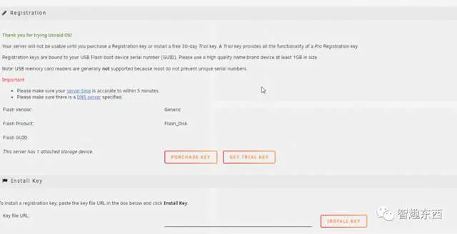 第一次打开后,UNRIAD配置页面右上角会提示Unregistered/未注册。此时,点击下方右侧的“Get Trial KEY”按钮就可以获取试用版秘钥开始试用。需要注意一点,UNRIAD系统的时间必须和UNRIAD远端服务器的时间一致,否则是不能获取到试用秘钥的。