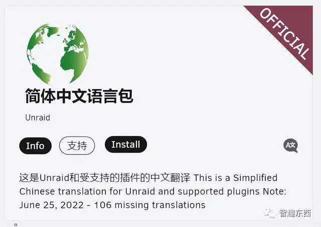 加载磁盘后,我们就可以进一步操作了——面对全英文界面可能很多人还是不习惯,我们可以进一步将其切换为中文版本。在UNRAID主界面点击“PLUGINS”,然后在“Install Plugin”中填写如下地址:https://gitee.com/BlueBuger/community.applications/raw/master/plugins/community.applications.plg,并点击后面的“INSTALL”按钮安装。