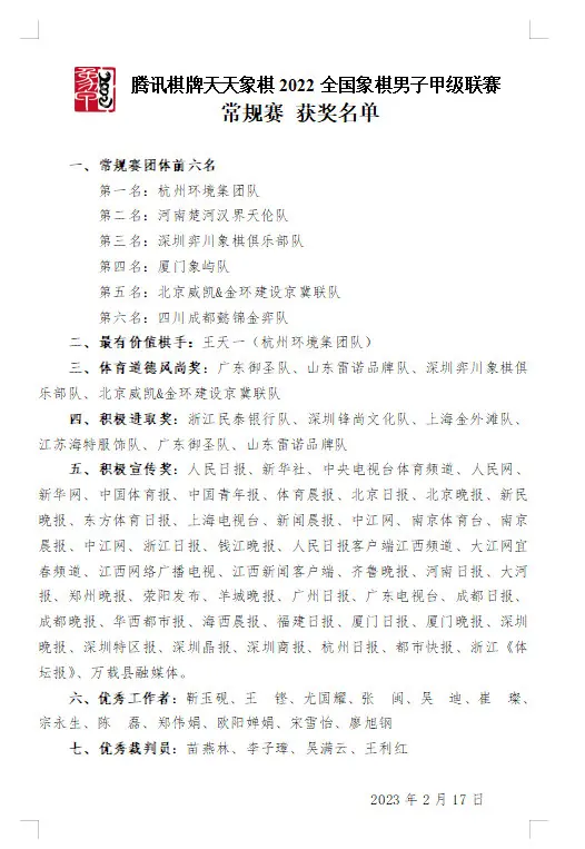 2023年2月17日,“腾讯棋牌 天天象棋”2022全国象棋男子甲级联赛“万载古城杯”第二阶段赛会制在江西宜春万载山水迎宾馆迎来了常规赛最后一轮比赛。经过四个多小时的激战,杭州环境集团队勇夺常规赛冠军,河南楚河汉界天伦队获得亚军。