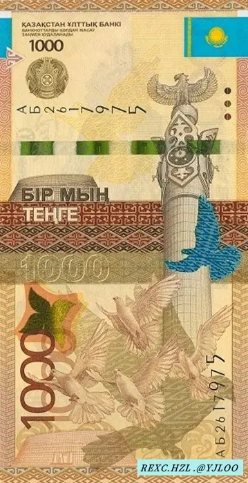 背面: 哈萨克斯坦 国徽、面额