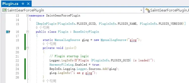 如图所示,我们新增并添加了一个叫glog的ManualLogSource,以及设置了HarmonyFileLog.Enabled