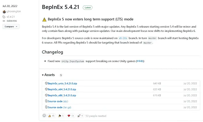如图所示,有几个不同的zip,我们本次练习的目标是amd64的,因此选择BepInEx_x64_5.4.21.0.zip下载