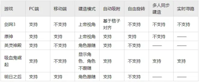 目前支持城建系统的游戏,比较火爆的有剑网3、原神、英灵神殿、吸血鬼崛起以及明日之后等等。通过在建造模式、PC端移动端适配、自动吸附等多方面对上述几个游戏进行对比,截止到2022年11月,得到结论如下:
