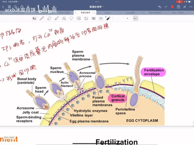 精子顶体酶释放,水解卵表面的胶质保护层,肌动蛋白丝伸长固定(锚定)精子,发生精卵细胞的膜融合,头部伸入。
