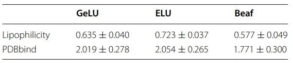 为了验证激活函数Beaf在模型上的优势,作者对激活函数选择进行了实验验证。在六个数据集上评估分别带有激活函数Beaf、ELU 和 GeLU模型的性能,如表1和2所示。在回归任务上,Lipophilicity 和 PDBbind数据集上使用Beaf具有显着优势。在分类任务上,PCBA、Tox21和SIDER数据集上使用Beaf具有显着优势。因此作者选用Beaf作为模型的激活函数,并进行与其他模型性能的评估。