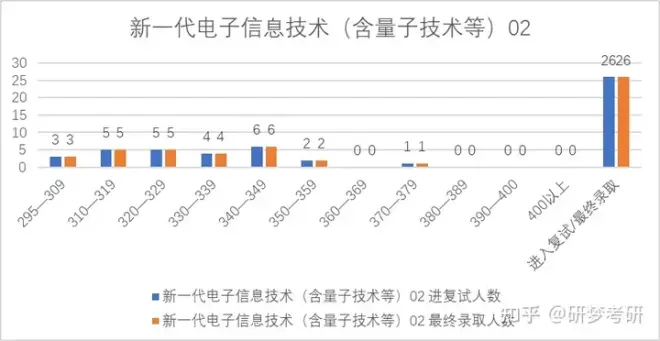 4、085402电子工程(含宽带网络、移动通信等)本部01一志愿报满,但是03广研院一志愿并没有报满,因此一志愿全部录取。那么01本部淘汰的33人中调剂到03广研院12人,调剂中最高分373分,均分341.5分,最低分322分。04杭研院仅多报1人,即一志愿只淘汰1人,因此最终专硕02总录取107人,总淘汰22人。