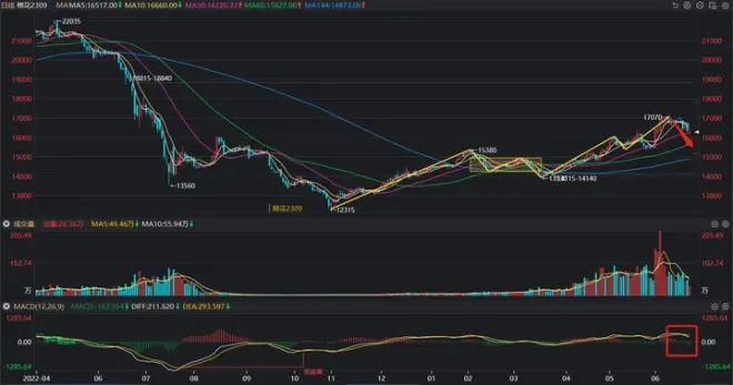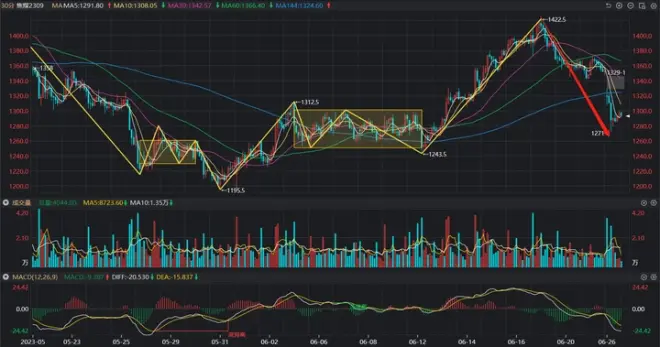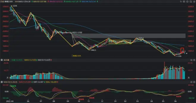 焦煤今日收阴,日线等待分型的确认,焦煤可能走势更清晰一些,这里分型确认后可以看作中枢构建,考虑介入,内部结构上,30分钟一笔下回到了零轴下方,那么耐心等待一笔反弹不破零轴就可以介入了。再看5分钟图,配合MACD指标看,意味着夜盘还有3卖的可能;