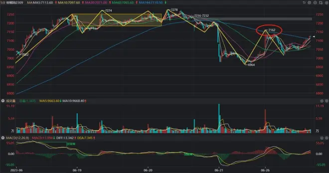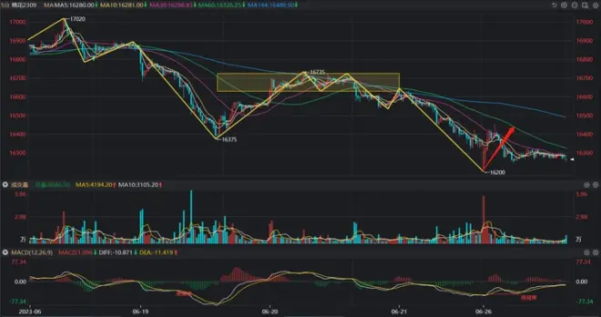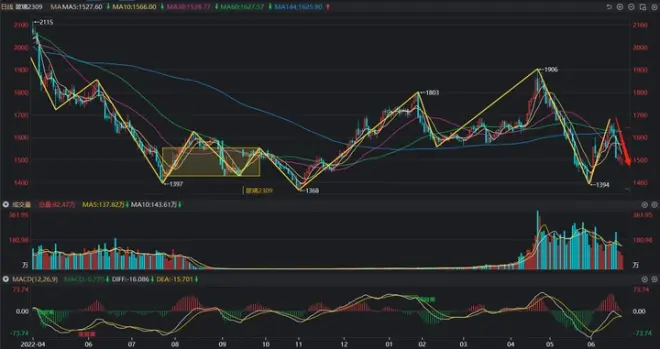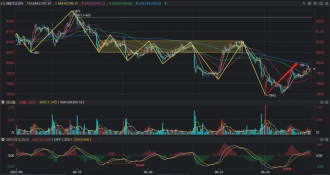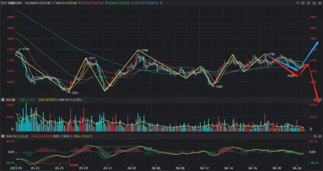 纯碱今日收阳,日线一笔反弹对待,不过MACD是偏弱的,还需要谨慎对待多头,内部结构上,30分钟后续走势有红蓝两种剧本,虽然当先一笔下破了零轴,但是破的并不到位,所以纯碱暂时继续观察为宜;