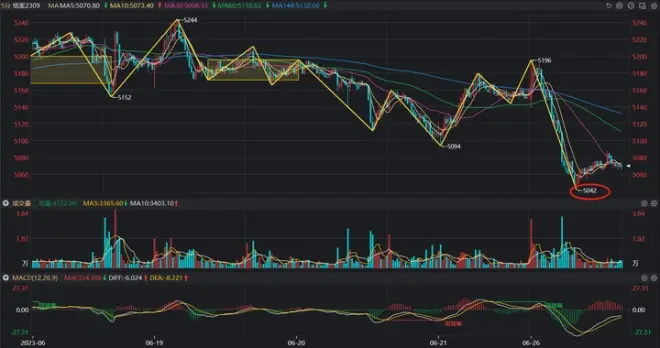 棕榈油今日收小阳,日线一笔反弹对待,等待上方分型的确认,当前MACD正好处在零轴附近,那么如果在这里确认,先以第二个中枢构建对待,个人计划参与一笔下,内部结构上,30分钟一笔下未结束,先等分型的确认,之后一笔反弹不过零轴就是介入的位置。再看5分钟图,夜盘如果能上破红圈处,则确认30分钟一笔下结束,否则下探延续;