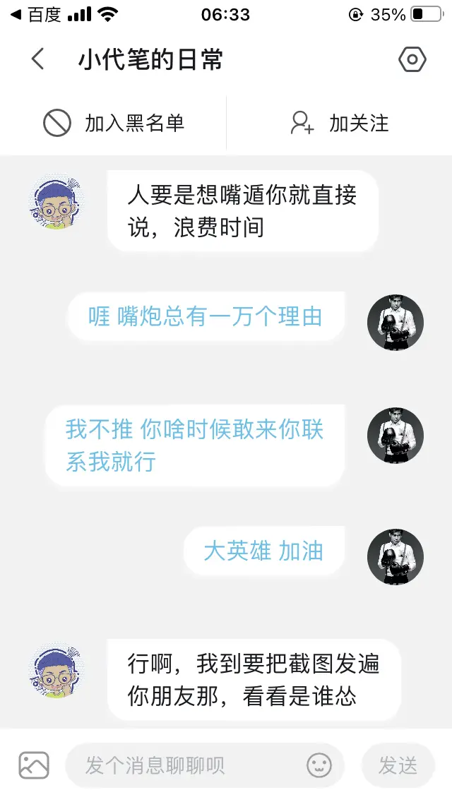 一个怂货装13失败不敢实战的心路历程,最后直接给我拉黑了。哎,网络武林的真实现状