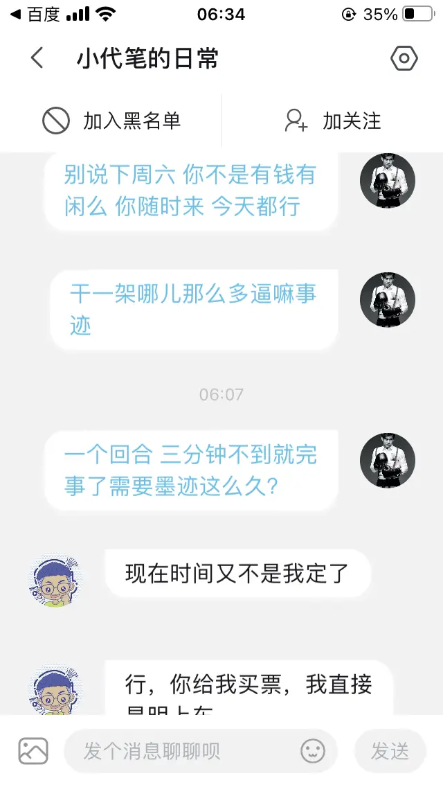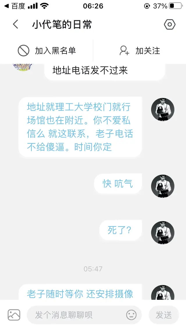 其人先黑传武又黑山西又黑母校 号称无爱国情怀 号称有俩小钱 号称挥拳发威 如此牛逼却都逃不过一个“怂”字。 约个三分钟一回合肥实战,愣私信墨迹一晚。先应战斗欲来晋干架,顺它。马上又换成要我去南京。暑假场馆会员天天爆满根本离不开。只得劝其来晋,地点是其母校,时间由其定,规则由其选,均顺之。又变,称先打钱才去。闻之话术太熟,像几年前搏击实战约战群里常有经典语录,此话术一出,往往十约九黄,屡试不爽。我也曾被此类者骗过路费,苦不堪言。欲先请其来,我亲去接站给其双倍票费。对方不应,沉默片刻后又开启嘴炮模式泼妇骂街……准备再次确定约战,哎,背其勇敢的拉黑。无语,望南…..