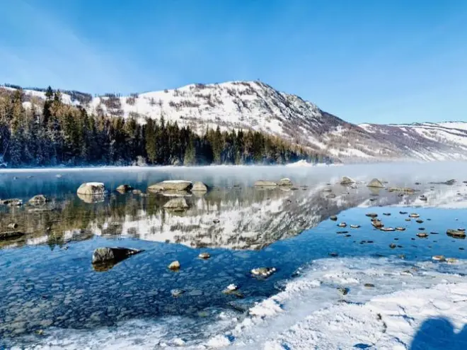 白雪皑皑的冬天,喀纳斯湖静静地坐落在阿尔泰深山密林中,湖面碧波万顷,群峰倒影,随着气候和天气的变化而时时变换颜色。