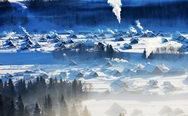 冬日的禾木,山坳间的村庄,山脚的莽莽林海,白了头的肃穆荒岭,错落有致的幢幢木屋,还有那沿村路两旁向前无限舒展开的茫茫田野,有一种广阔无边的梦幻。