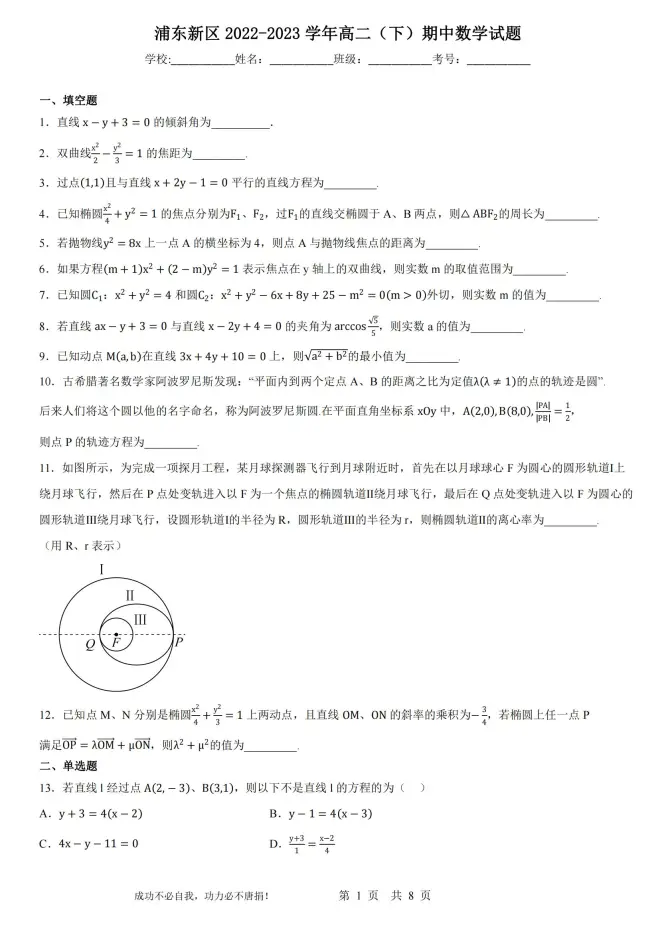 浦东新区2023年高二(下)期中数学试题(最新详细解析)