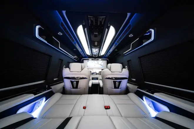 所以定制方案上,从7座全隔断到9座通舱布局都能轻松胜任,目前我们上海门店的这款定制方案就是9座版本,刚好能符合想要满足更多使用场景的大佬们。