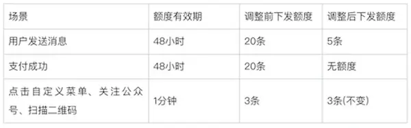 取消支付场景下开发者的客服消息下发额度,同时在用户回复消息场景下,开发者在收到事件通知后48h内可向用户下发客服消息额度由20条回收至5条;点击自定义菜单、关注公众号、扫描二维码三个场景中规则不变。