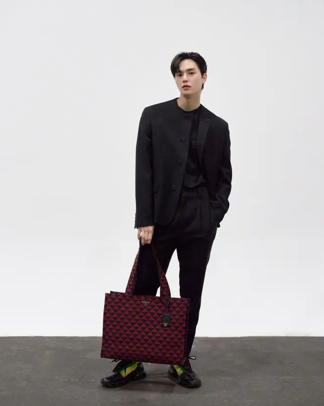 当然了,他也穿过一些像这样的无领外套,其实还蛮容易显老的,但他就很神气,用自己的气质去化解了这一身。当然了,大家也可以像他一样,拿上一个特别一点的包包,再加上运动鞋的存在,整体好看很多。
