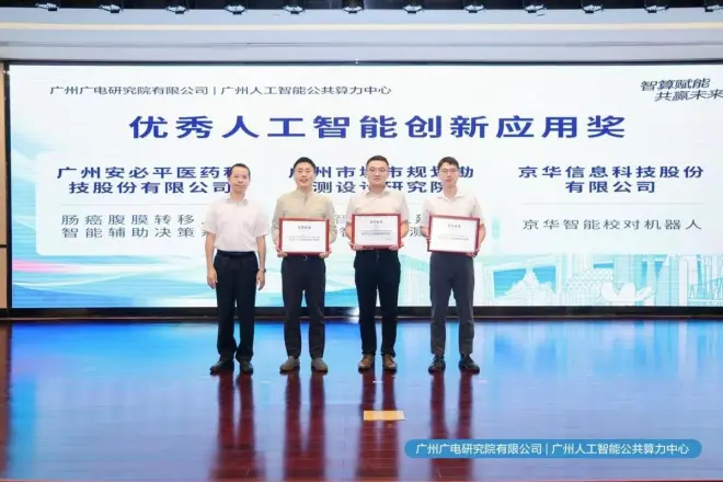 为展示广州人工智能公共算力中心与产业链优秀伙伴合作成果、分享人工智能赋能广州的新亮点,算力中心为企业优秀解决方案颁发“优秀人工智能创新应用奖”。会上,广州安必平医药科技股份有限公司的“肠癌腹膜转移人工智能辅助决策系统”、京华信息科技股份有限公司的“京华智能校对机器人”、广州市城市规划勘测设计研究院的“面向智慧农业建设的遥感智能检测服务”相关代表领奖并做案例经验分享。