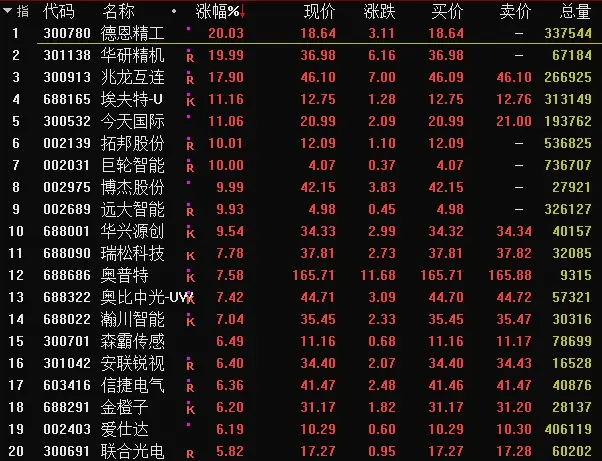 华研精机、德恩精工20CM涨停,兆龙互连、埃夫特、今天国际涨超10%,巨轮智能、博杰股份、远大智能涨停,华兴源创、拓邦股份、奥普特等股跟涨。
