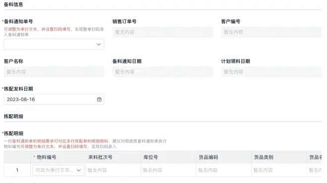 拣配发料单:根据备料通知单,系统生成拣配发料单,指导仓库人员按照需求准确地拣选库存,并生成发料记录。