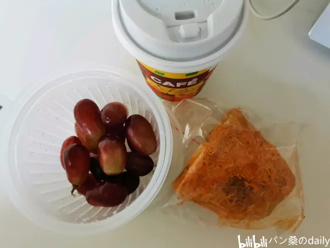 朝ご飯:3/5个辣松麻薯面包(好吃是好吃,但是辣松有点太辣了吧😂)、红提吃了5颗左右,没吃完,711热美式。