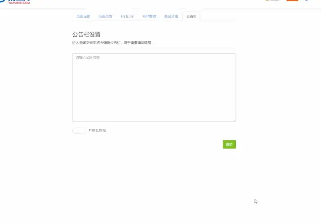 在公告栏栏目点击“开启公告栏”开关,使开关变灰,点击提交按钮,即可关闭公告栏,进入查询首页不再弹出公告栏。