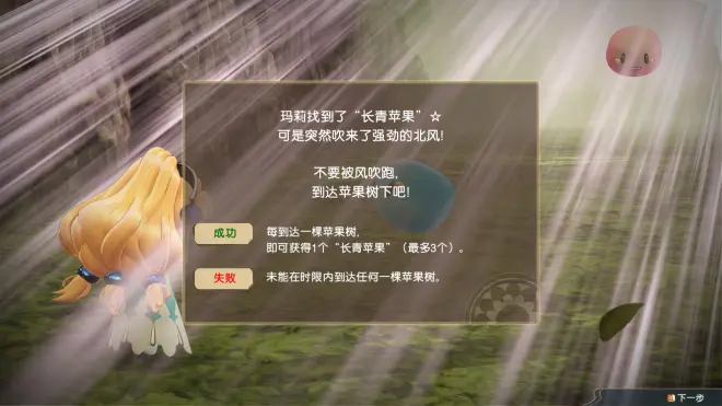 这里要注意雇佣精灵之后,要在行程表派遣去采集或者制作调和,从而节省一定的时间,不过精灵只能采集普通道具,一些春夏季节出现的特定材料道具还是需要你自己前往采集,探索时如果地图上找不到你需要的道具,那么不妨使用简易采集。游戏中会随机遇到六个不同的小游戏,迎风前进躲避敌人摘到长青苹果,躲避熊的追捕取回黄金蛙等等。