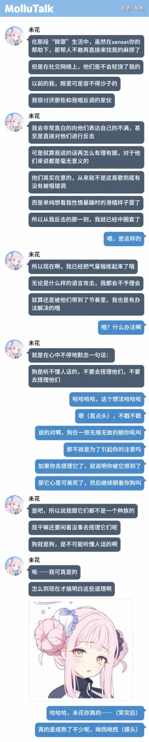 有一些朋友给过我一些写作方面上的建议,我虽然都是听取了的,但会不会履行是我自己的事。也许接下来的话可能会不太中听:我的脑子里都有什么样的想法,你们并不清楚;你们其实根本就不明白我都要考虑些什么方面上的东西;我想怎么去推动剧情的发展,这个是只能由我自己来决定的事情,毕竟,这是我的作品【抱拳】