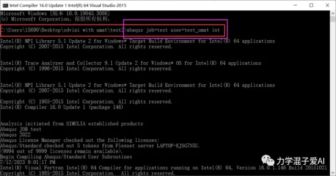 (2)复制下面的命令到cmd窗口中,回车(目录为当前子程序所在位置;注意改成自己的文件名,job=inp文件名,user=子程序文件名)