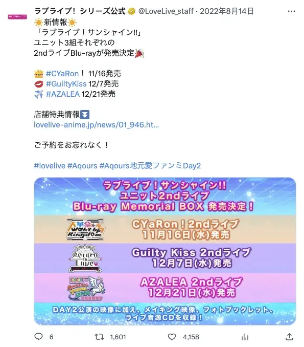 四年前的今天,2019年8月14日,宣布将于2019年8月21日播出LoveLive!生放送 μ's 9周年课外活动。