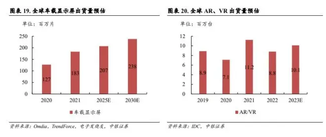 TrendForce 预计 2021~2026 年车用显示芯片产值将以 10 倍以上的速度增长。此外,AR、VR 等新型显示应用产品的增长也将为屏幕市场贡献增量。根据 IDC 预估,2023 年全球 AR、VR 出货量将达到 1,010 万台,同比增长约 14.8%。2023 年 6 月 6 日,苹果在 WWDC 大会上发布旗下首个 MR(混合现实)头显设备 Vision Pro。Vision Pro 搭载超高分辨率显示系统,将2300 万像素置于两个显示屏中。我们预计随着 AR、VR 新应用的发展,相关超高分辨率显示系统也将为 DDIC 市场带来增量。