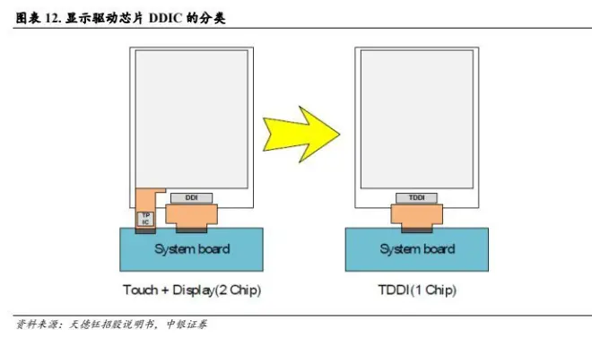按集成功能区分,DDIC 可以分为 Touch + Display、TDDI(Touch and Display Driver Integration)等。