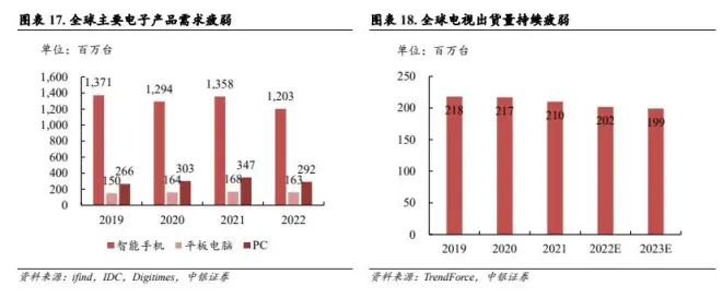 新应用为显示驱动芯片 DDIC 带来增量市场目前智能手机、平板电脑、PC 和电视等屏幕的载体依然是 DDIC 下游需求的主要来源。根据 IDC数据,2022 年全球智能手机、平板电脑、PC 的出货量分别为 12.03、1.63、2.92 亿部(台),同比均下滑。根据 TrendForce 预估,2022 年全球电视出货量为 2.02 亿台,自 2019 年起连续 3 年下滑。