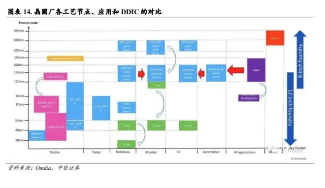 不同 DDIC 工艺节点可以归纳如下:大尺寸 HD LCD DDIC 为 200nm~300nm;大尺寸 FHD LCD DDIC 为 110nm~160nm; 大 尺 寸 UHD LCD DDIC 为 55nm~90nm ; 小 尺 寸 LCD TDDI 为55nm~90nm;小尺寸 HD LCD TDDI 为 55nm~110nm;小尺寸 FHD LCD TDDI 为 40nm~55nm;HD OLED DDIC 为 28~40nm。