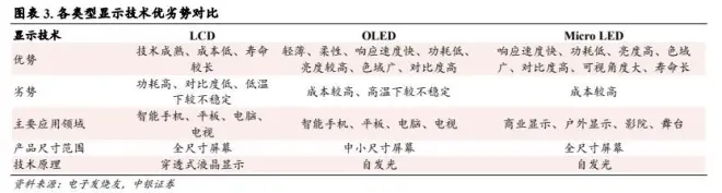 Micro LED 因为芯片尺寸较小、集成度高、自发光的特点,与 LCD 和 OLED 相比,在亮度、分辨率、对比度、能耗、使用寿命、响应速度和热稳定性等方面具有更大的优势。但是 Micro LED 因为巨量转移技术不够成熟,成本限制了技术的发展速度。