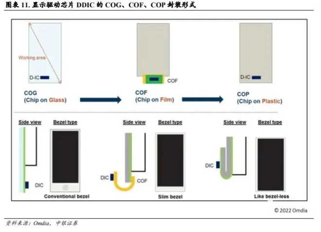 COG 是将 DDIC 封装在屏幕玻璃表面上,该技术成本低、良率高,但是边框较宽。COF 是将 DDIC封装在屏幕和主板之间的 FPC 排线上,该技术可以实现“超窄边框”的效果。COP 仅适用于 OLED屏幕,该技术通过可弯折塑料基材连接 DDIC 和 FPC,从而实现“无边框”的效果。