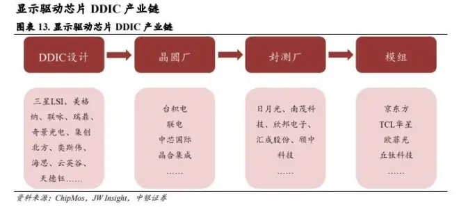 显示驱动芯片 DDIC 产业链由芯片设计、晶圆代工、芯片封测、模组组装构成。因为显示产品具有多样性,所以其对应 DDIC 需求的工艺节点覆盖范围也比较广,涵盖 28nm~300nm。