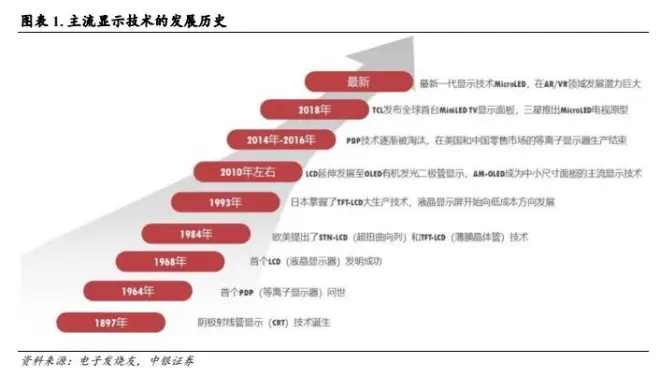 LCD 和 OLED 主导显示市场,MICRO LED 蓄势待发显示技术可以实现将电信号转换为视觉信号的效果。目前显示技术已经完成从阴极射线显示技术(CRT)向平板显示技术(FPD)的升级。而平板显示技术(FPD)也拓展出液晶显示(LCD)、有机发光二极管显示(OLED)、发光二极管显示器(Micro LED)等多条技术路线。