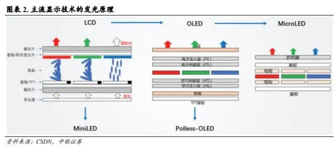 第三代显示技术 OLED 通过掩模版将有机发光材料以子像素为单位蒸镀至基板上。有机发光材料通电后可以实现自发光,从而实现单个像素组(RGB)的颜色。OLED 显示技术像素密度高,色彩还原度好,视觉感受上更加鲜艳。